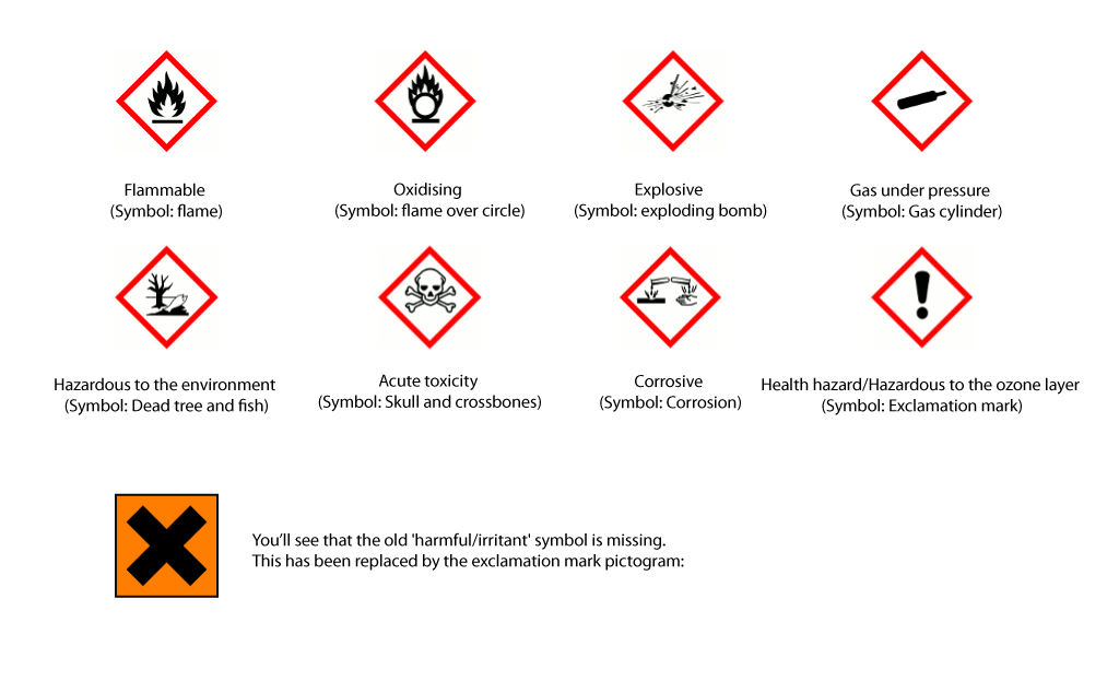 Chemicals, materials or equipment may include a label identifying the specific type of hazard.
